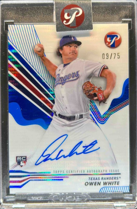 The Owen White 2024 Topps Pristine #PA-OW Pristine Autographs - Blue Pristine Refractor /75 Rookie card is 1 of 26 Owen White's card variations in the 2024 Topps Pristine set being tracked by Sports Card Investor, including Base, Pristine Refractor, Refractor, Green Refractor /150, and Pristine Purple Refractor /99.