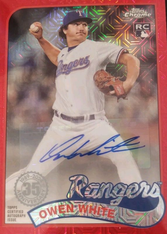 The Owen White 2024 Topps Silver Pack #T89C-13 1989 Chrome Promo Autographs - Red Refractor (Series 1) /5 Rookie card in Raw condition has not changed in price in the last 30 days and was last sold for $130.00 .
