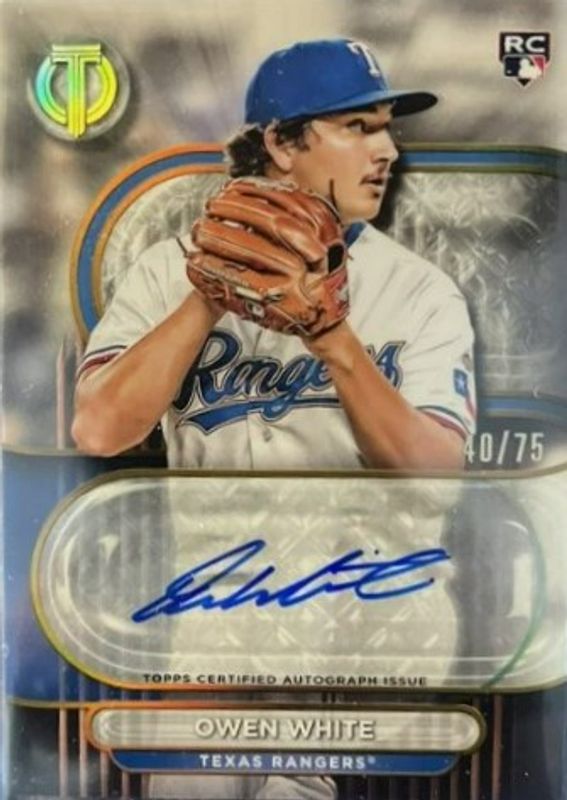 The Owen White 2024 Topps Tribute #TA-WHI Tribute Autographs - Gold /75 Rookie card is 1 of 12 Owen White's card variations in the 2024 Topps Tribute set being tracked by Sports Card Investor, including Tribute Autographs /199, Tribute Autographs - Blue /150, Tribute Autographs - Green /99, Tribute Autographs - Purple /50, and Tribute Autographs - Orange /25.