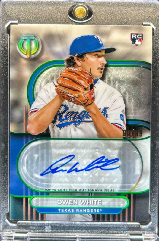 The Owen White 2024 Topps Tribute #TA-WHI Tribute Autographs - Green /99 Rookie card is 1 of 12 Owen White's card variations in the 2024 Topps Tribute set being tracked by Sports Card Investor, including Tribute Autographs /199, Tribute Autographs - Blue /150, Tribute Autographs - Gold /75, Tribute Autographs - Purple /50, and Tribute Autographs - Orange /25.