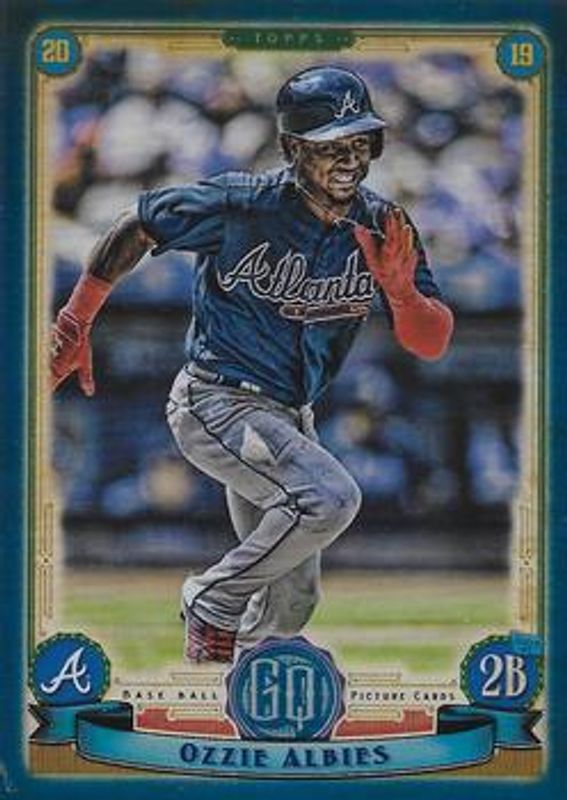 The Ozzie Albies 2019 Topps Gypsy Queen #104 Indigo /250 card is 1 of 24 Ozzie Albies' card variations in the 2019 Topps Gypsy Queen set being tracked by Sports Card Investor, including Base, Bazooka Back, GQ Logo Swap, Green, and Missing Nameplate.