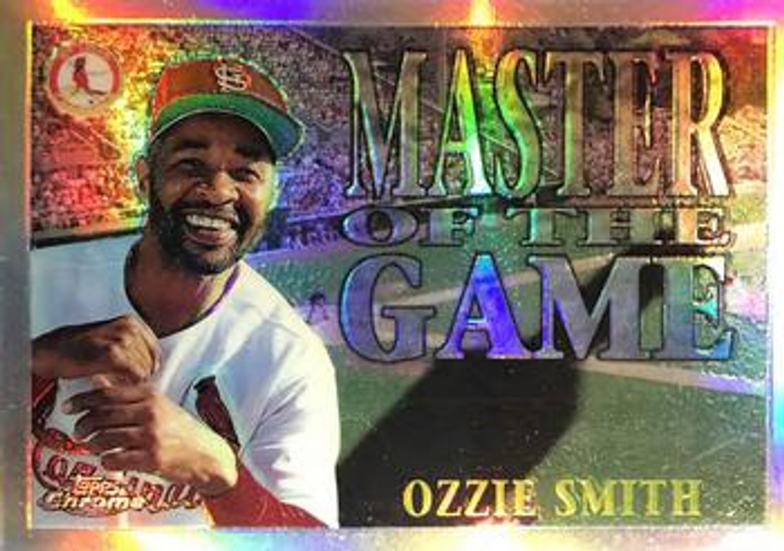 The Ozzie Smith 1996 Topps Chrome #MG5 Masters of the Game - Refractor card is 1 of 4 Ozzie Smith's card variations in the 1996 Topps Chrome set being tracked by Sports Card Investor, including Base, Refractor, and Masters of the Game.