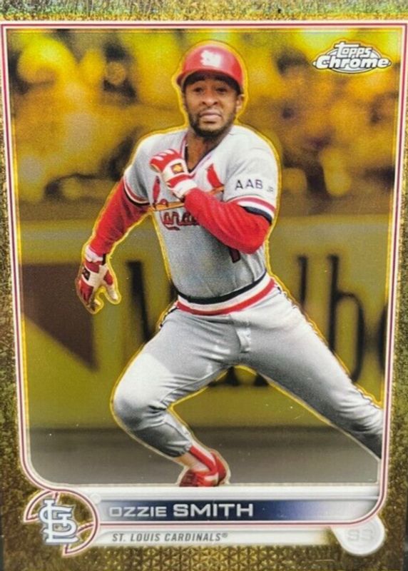 This card is 1 of 18 Ozzie Smith's card variations in the 2022 Topps Gilded Collection set being tracked by Sports Card Investor, including Mini-Diamond Gold Etch Refractor /50, RayWave Gold Etch Refractor /25, Lava Gold Etch Refractor /10, Superfractor /1, and Gold Framed Hall of Famer Autographs /99.