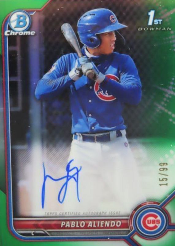 Best Prices Available For Sale of Pablo Aliendo 2022 Bowman #CPA-PA Chrome Prospect Auto - Green Refractor /99 (1st)