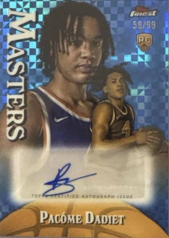 The Pacome Dadiet 2024 Topps Finest #MA-PD Masters Autographs - Blue X-Fractor /99 Rookie card is 1 of 73 Pacome Dadiet's card variations in the 2024 Topps Finest set being tracked by Sports Card Investor, including Arrivals, Arrivals - Geometric Refractor, Arrivals - Refractor, Arrivals - X-Fractor, and Colossal Shots Autographs - Geometric Refractor.
