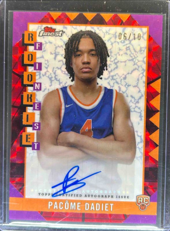 The Pacome Dadiet 2024 Topps Finest #RFA-PD Rookie Finest Autographs - Red Black Geometric Refractor /10 card is 1 of 73 Pacome Dadiet's card variations in the 2024 Topps Finest set being tracked by Sports Card Investor, including Arrivals, Arrivals - Geometric Refractor, Arrivals - Refractor, Arrivals - X-Fractor, and Colossal Shots Autographs - Geometric Refractor.