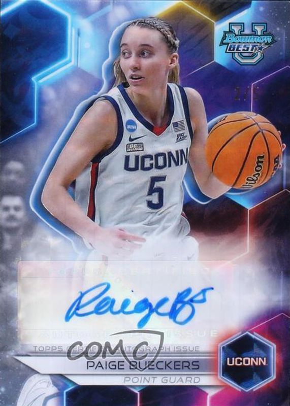 The Paige Bueckers 2023 Bowman Best University #B23-PB Best of 2023 Autographs - Geometric White Refractor /5 card in Raw condition has not changed in price in the last 30 days and was last sold for $460.00 .