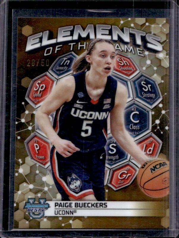 The Paige Bueckers 2023 Bowman Best University #EG-6 Elements of the Game - Gold Refractor /50 card is 1 of 70 Paige Bueckers' card variations in the 2023 Bowman Best University set being tracked by Sports Card Investor, including Base, Refractor, Speckle Refractor, Blue Refractor /150, and Pink Lava Refractor /100.