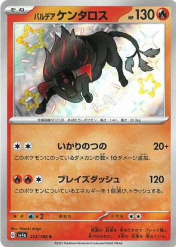 The Paldean Tauros 2023 Japanese Scarlet & Violet: Shiny Treasure ex #212/190 Shiny Rare card in Raw TCG (Near Mint) condition has not changed in price in the last 30 days and was last sold for $3.27 .