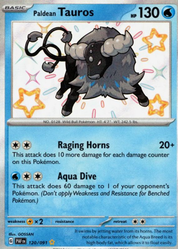 The Paldean Tauros 2024 Scarlet & Violet: Paldean Fates #120/091 Shiny Rare card in Raw TCG (Near Mint) condition has moved down -$0.75 (-20.0%) in the last 30 days and was last sold for $3.00 .