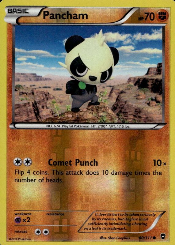 The Pancham 2014 XY: Furious Fists #060/111 Reverse Holo card in Raw TCG (Lightly Played) condition has not changed in price in the last 30 days and was last sold for $2.53 .