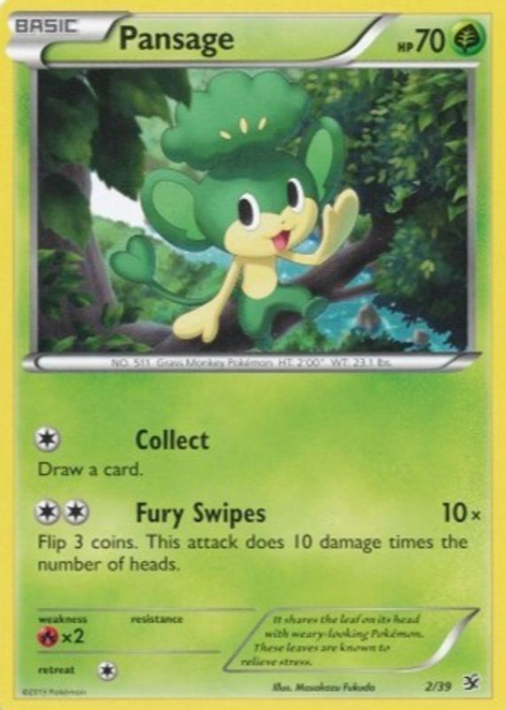 The Pansage 2013 XY: Kalos Starter Set #02/39 Base card in Raw TCG (Near Mint) condition has not changed in price in the last 30 days and was last sold for $4.98 .