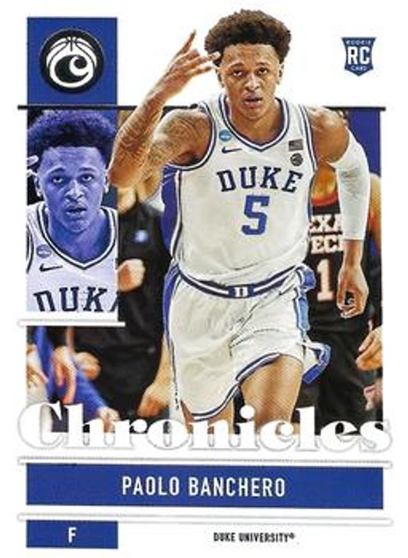 The Paolo Banchero 2022 Chronicles Draft Picks #2 Base Rookie card is 1 of 215 Paolo Banchero's card variations in the 2022 Chronicles Draft Picks set being tracked by Sports Card Investor, including Black, Bronze, Pink, Pulsar, and Red /149.