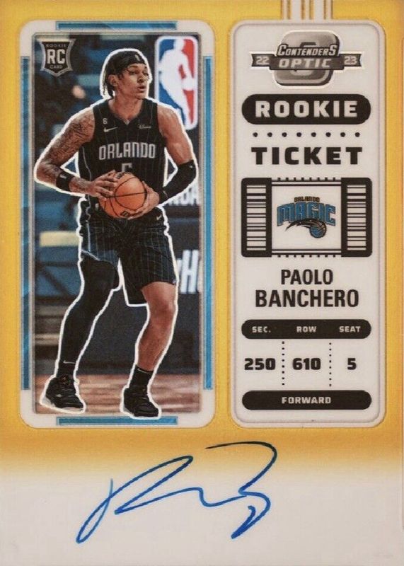 The Paolo Banchero 2022 Contenders Optic #118 Rookie Ticket Auto - Gold /10 card in Raw condition has not changed in price in the last 30 days and was last sold for $4,716.67 .