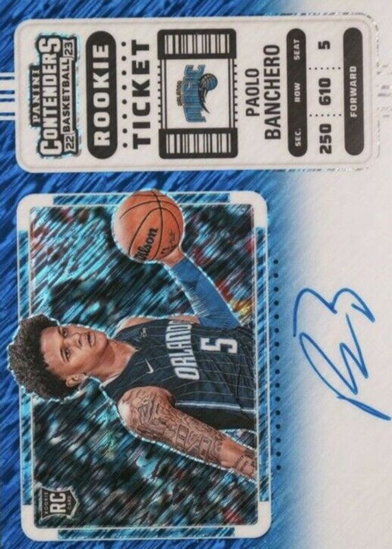 This card is 1 of 27 Paolo Banchero's card variations in the 2022 Contenders set being tracked by Sports Card Investor, including Rookie Ticket Auto, Rookie Ticket Auto - Premium, Rookie Ticket Auto - Premium Green Shimmer, Rookie Ticket Auto - Ticket Stub (/5), and Rookie Ticket Auto Variation.