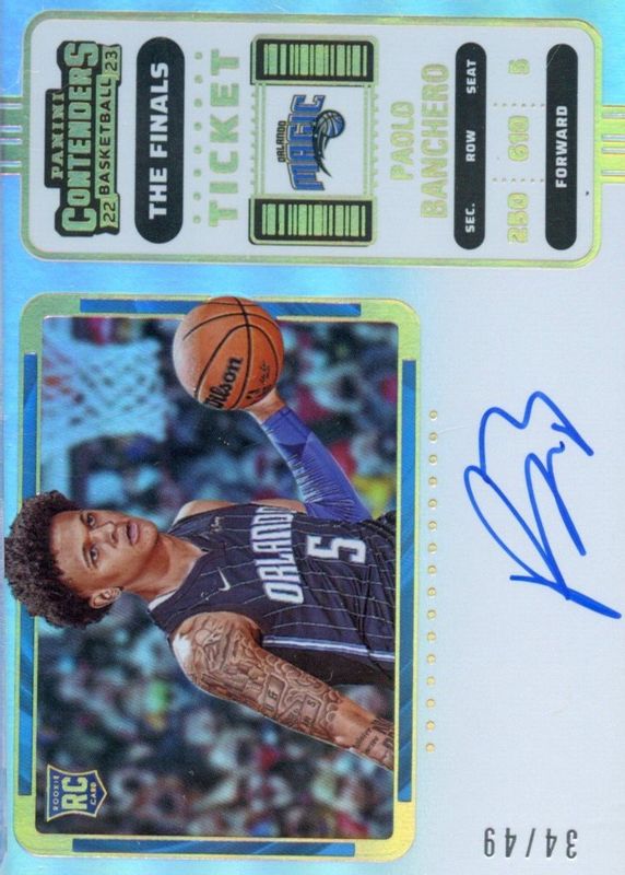 The Paolo Banchero 2022 Contenders #112 Rookie Ticket Auto - The Finals Ticket /49 card in Raw condition has not changed in price in the last 30 days and was last sold for $450.00 .