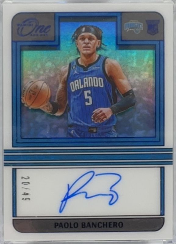 The Paolo Banchero 2022 One and One #RA-PB5 Rookie Autographs - Blue /49 card is 1 of 55 Paolo Banchero's card variations in the 2022 One and One set being tracked by Sports Card Investor, including Base /99, Blue /40, Purple /25, Red /15, and Gold /10.