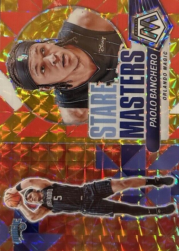 This card is 1 of 18 Paolo Banchero's card variations in the 2023 Mosaic set being tracked by Sports Card Investor, including Choice Peacock /(SSP), Genesis /(SSP), Glitter /(SSP), White Sparkle /(SSP), and Fast Break Gold /10.