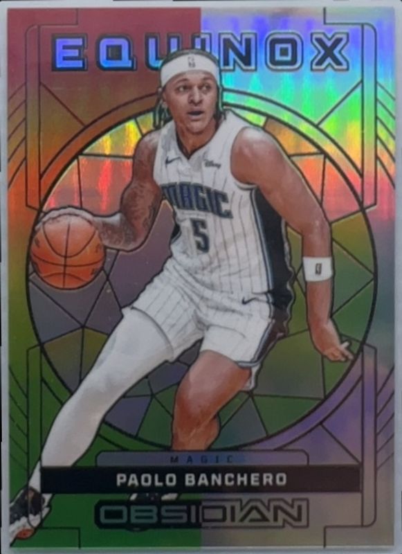 The Paolo Banchero 2023 Obsidian #1 Equinox - Electric Etch Reggae Flood /60 card is 1 of 38 Paolo Banchero's card variations in the 2023 Obsidian set being tracked by Sports Card Investor, including Base, Electric Etch International, Electric Etch Neon Flood, Electric Etch Pink Pulsar, and Electric Etch Red Flood.