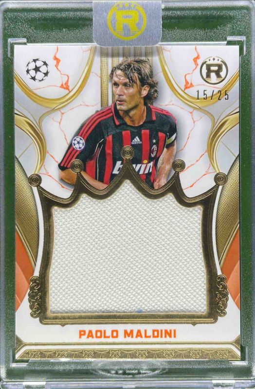 The Paolo Maldini 2024 Topps Reverence UEFA Club Competitions #RJR-PM Reverence Jumbo Relics - Orange /25 card is 1 of 26 Paolo Maldini's card variations in the 2024 Topps Reverence UEFA Club Competitions set being tracked by Sports Card Investor, including Coronation Day Crowned Legends Autographs, Crowned Legend Autographed Jewel Relics, Reverence Autographed Patches, Reverence Jumbo Relics, and Crowned Legend Autographs /99.