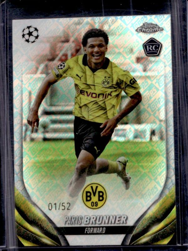The Paris Brunner 2023 Topps Chrome UEFA Club Competitions #44 Toppsfractor /52 Rookie card is 1 of 55 Paris Brunner's card variations in the 2023 Topps Chrome UEFA Club Competitions set being tracked by Sports Card Investor, including Base, Aqua Lava Refractor, Aqua Prism Refractor, Blue Lava Refractor, and Gold Lava Refractor.