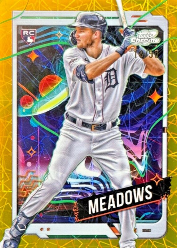 The Parker Meadows 2024 Topps Chrome Cosmic #127 Gold Interstellar Refractor /50 Rookie card in Raw condition has not changed in price in the last 30 days and was last sold for $3.51 .