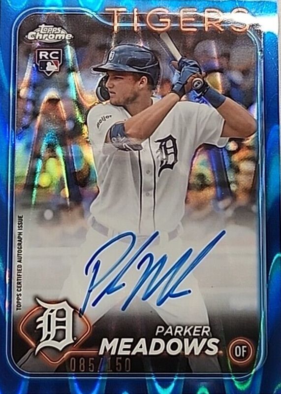 The Parker Meadows 2024 Topps Chrome #RA-PM Rookie Autographs - Blue RayWave Refractor /150 card in Raw condition has not changed in price in the last 30 days and was last sold for $20.00 .