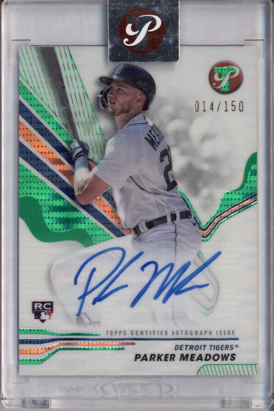 The Parker Meadows 2024 Topps Pristine #PA-PM Pristine Autographs - Green Pristine Refractor /150 Rookie card is 1 of 26 Parker Meadows' card variations in the 2024 Topps Pristine set being tracked by Sports Card Investor, including Base, Pristine Refractor, Refractor, Green Refractor /150, and Pristine Purple Refractor /99.