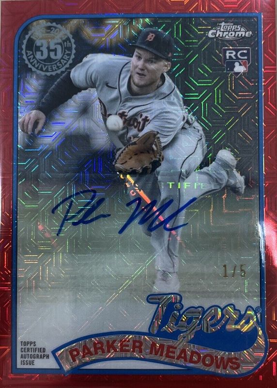 The Parker Meadows 2024 Topps Silver Pack #2T89C-37 1989 Chrome Promo Autographs - Red Refractor (Series 2) /5 Rookie card in Raw condition has not changed in price in the last 30 days and was last sold for $125.00 .