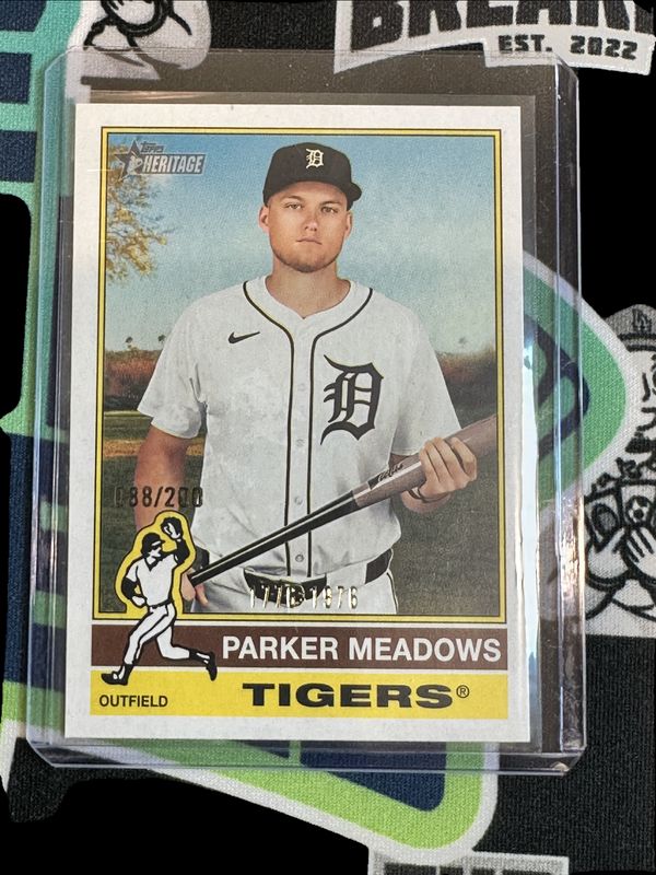 The Parker Meadows 2025 Topps Heritage #483 Bicentennial /200 card is 1 of 24 Parker Meadows' card variations in the 2025 Topps Heritage set being tracked by Sports Card Investor, including Base, Black Border, Dark Blue Border, Dark Green Border, and Dark Yellow Border.
