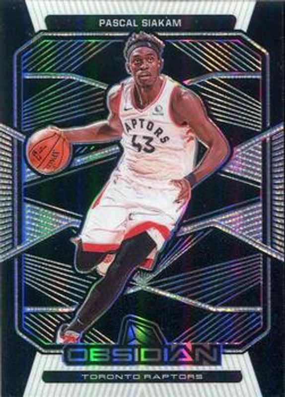 The Pascal Siakam 2019 Obsidian #24 Base card is 1 of 38 Pascal Siakam's card variations in the 2019 Obsidian set being tracked by Sports Card Investor, including Electric Etch Purple /75, Electric Etch Orange /50, Electric Etch White Pulsar /SSP, Electric Etch Green /25, and Electric Etch Blue FOTL /16.