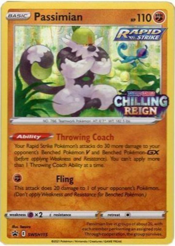 The Passimian 2021 Sword & Shield: Black Star Promo #SWSH115 Build & Battle Box (Chilling Reign) card in Raw TCG (Near Mint) condition has moved down -$0.80 (-28.7%) in the last 30 days and was last sold for $1.99 .