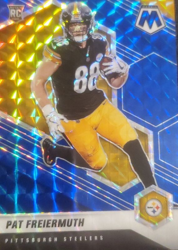 The Pat Freiermuth 2021 Mosaic #332 Blue /99 Rookie card in Raw condition has not changed in price in the last 30 days and was last sold for $2.25 .