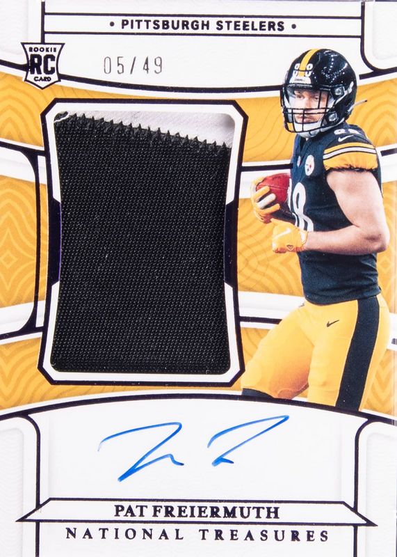 This card is 1 of 16 Pat Freiermuth's card variations in the 2021 National Treasures set being tracked by Sports Card Investor, including Rookie Patch Auto /99, Rookie Patch Auto - Green Jersey Number (/88), Rookie Patch Auto - Holo Silver /25, Rookie Patch Auto - Stars & Stripes Holo Silver /25, and Rookie Patch Auto - Midnight /20.