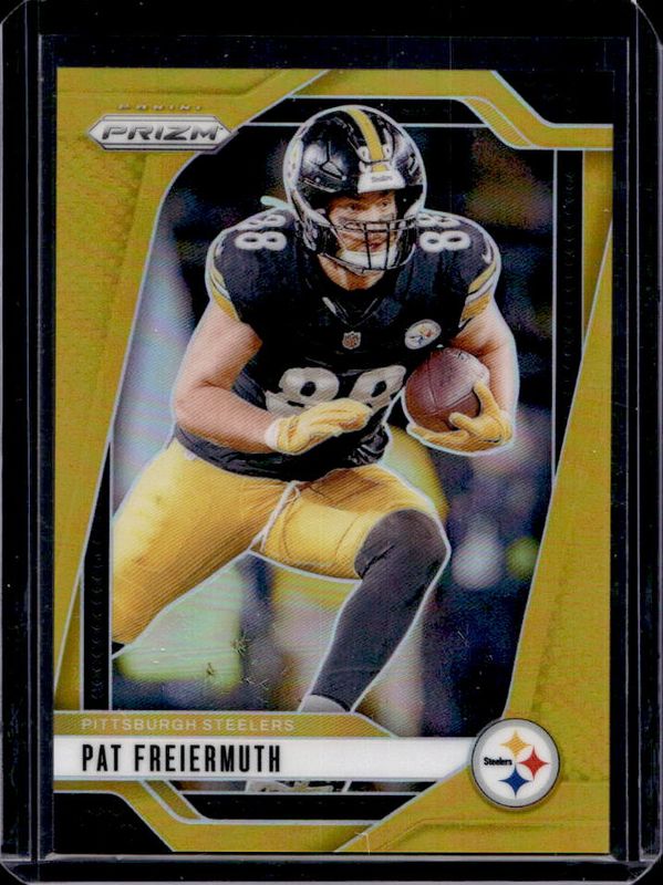The Pat Freiermuth 2024 Prizm #244 Gold /10 card is 1 of 83 Pat Freiermuth's card variations in the 2024 Prizm set being tracked by Sports Card Investor, including Base, Choice Blue Yellow Green, Choice Silver, Disco, and Green.