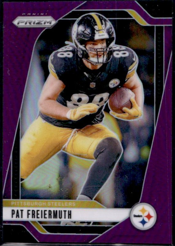 The Pat Freiermuth 2024 Prizm #244 Purple /125 card is 1 of 83 Pat Freiermuth's card variations in the 2024 Prizm set being tracked by Sports Card Investor, including Base, Choice Blue Yellow Green, Choice Silver, Disco, and Green.