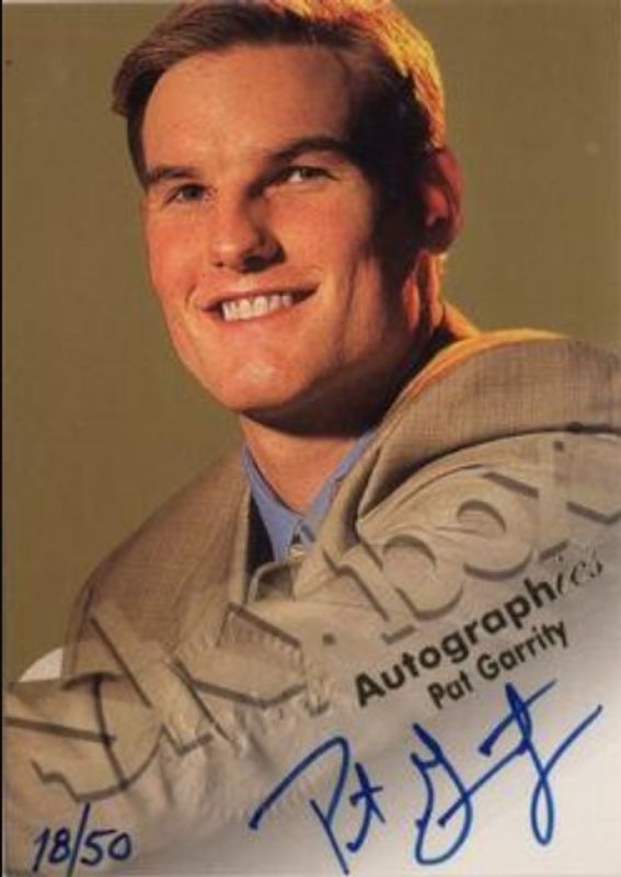 The Pat Garrity 1998 Skybox Premium Autographics Blue /50 Rookie card is 1 of 5 Pat Garrity's card variations in the 1998 Skybox Premium set being tracked by Sports Card Investor, including Base, Star Rubies /50, Rookies - Rubies /25, and Autographics.