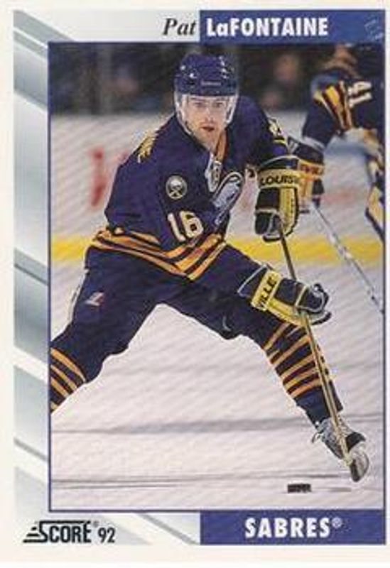 The Pat LaFontaine 1992 Score #6 Base card is 1 of 5 Pat LaFontaine's card variations in the 1992 Score set being tracked by Sports Card Investor, including Base, Samples, Sharp Shooters, and USA Greats.