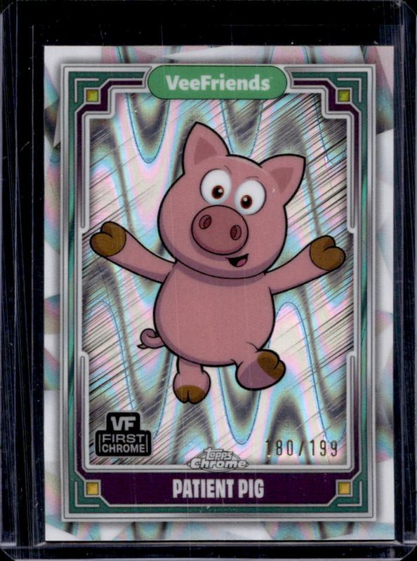 The Patient Pig 2025 Topps Chrome VeeFriends #12 RayWave Refractor /199 card is 1 of 21 Patient Pig's card variations in the 2025 Topps Chrome VeeFriends set being tracked by Sports Card Investor, including Base, Refractor, Yellow Refractor, Shimmer Refractor /250, and Wave Refractor /150.