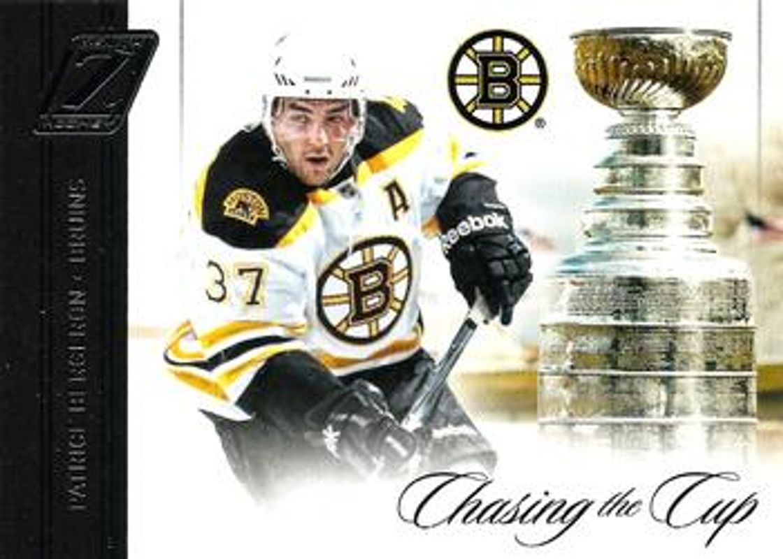 The Patrice Bergeron 2010 Zenith #14 Chasing the Cup card is 1 of 10 Patrice Bergeron's card variations in the 2010 Zenith set being tracked by Sports Card Investor, including Base /999, Red Hot, White Hot /25, Epix, and Epix Materials /100.