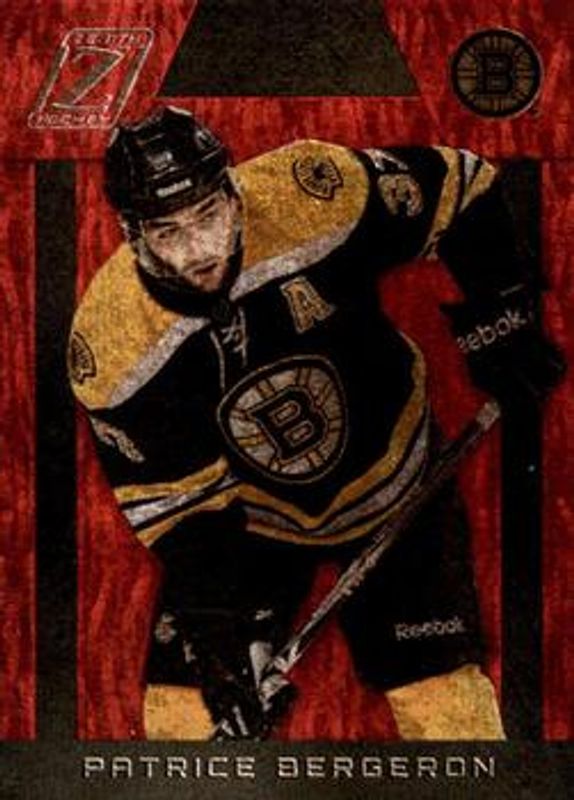 The Patrice Bergeron 2010 Zenith #7 Red Hot card is 1 of 10 Patrice Bergeron's card variations in the 2010 Zenith set being tracked by Sports Card Investor, including Base /999, White Hot /25, Chasing the Cup, Epix, and Epix Materials /100.