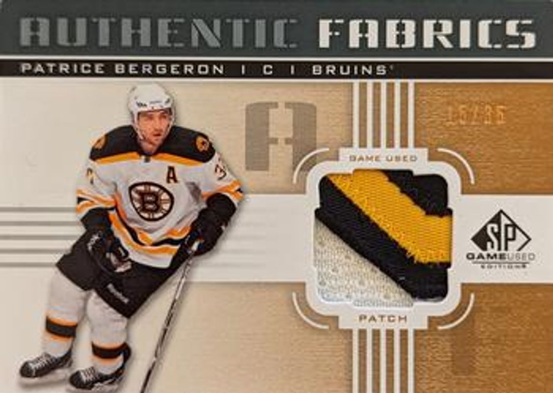 The Patrice Bergeron 2011 SP Game Used #AF-PB Authentic Fabrics Patches /35 card is 1 of 10 Patrice Bergeron's card variations in the 2011 SP Game Used set being tracked by Sports Card Investor, including #AF-PBa Authentic Fabrics - Gold, #AF-PBb Authentic Fabrics - Gold, #AF-PBc Authentic Fabrics - Gold, #AF-PBd Authentic Fabrics - Gold, and #CM-PB Championship Marks.