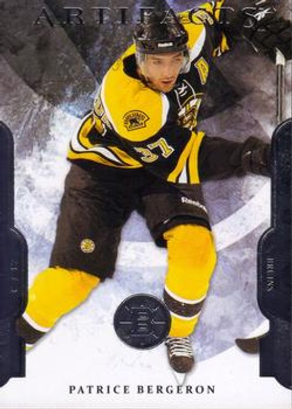 The Patrice Bergeron 2011 Upper Deck Artifacts #37 Base /699 card is 1 of 17 Patrice Bergeron's card variations in the 2011 Upper Deck Artifacts set being tracked by Sports Card Investor, including Emerald /99, Spectrum /25, Black /5, Autofacts, and Jerseys /125.