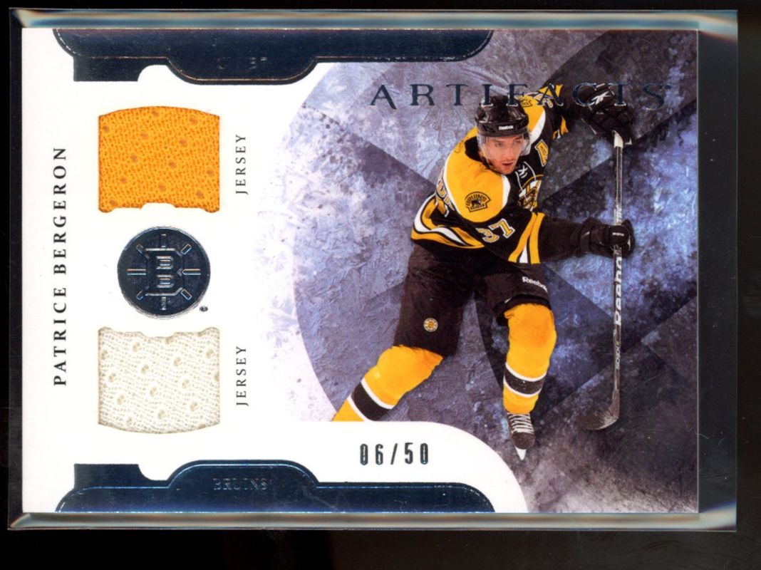 The Patrice Bergeron 2011 Upper Deck Artifacts #37 Horizontal Jerseys /50 card is 1 of 17 Patrice Bergeron's card variations in the 2011 Upper Deck Artifacts set being tracked by Sports Card Investor, including Base /699, Emerald /99, Spectrum /25, Black /5, and Autofacts.
