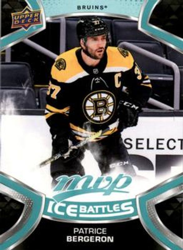 The Patrice Bergeron 2021 Upper Deck MVP #37 Ice Battles card is 1 of 28 Patrice Bergeron's card variations in the 2021 Upper Deck MVP set being tracked by Sports Card Investor, including Base, Blue, Gold Script, Silver Script, and Super Script /25.