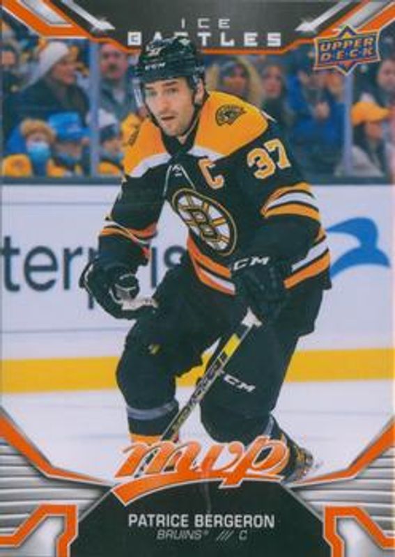 The Patrice Bergeron 2022 Upper Deck MVP #109 Ice Battles card is 1 of 24 Patrice Bergeron's card variations in the 2022 Upper Deck MVP set being tracked by Sports Card Investor, including Base, Blue Script, Gold Script, Silver Script, and Super Script /25.