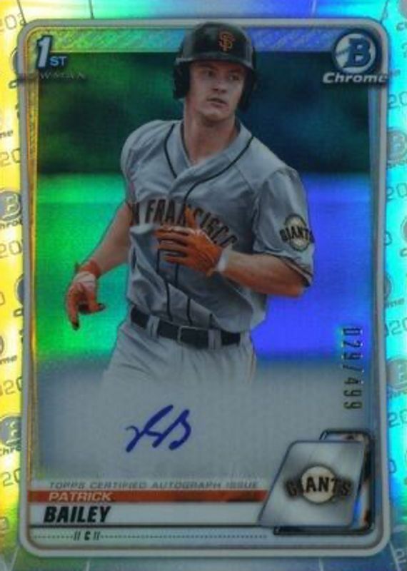 The Patrick Bailey 2020 Bowman Draft #CDA-PB Chrome DP Auto - Refractor /499 (1st) card in Raw condition has not changed in price in the last 30 days and was last sold for $15.50 .