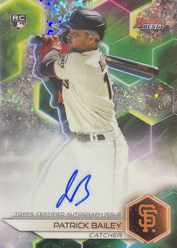 This card is 1 of 10 Patrick Bailey's card variations in the 2023 Bowman's Best set being tracked by Sports Card Investor, including Best of 2023 Autographs, Best of 2023 Autographs - Refractor, Best of 2023 Autographs - Blue Refractor /150, Best of 2023 Autographs - Green Refractor /99, and Best of 2023 Autographs - Gold Lava Refractor /75.