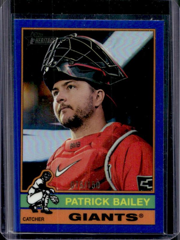 The Patrick Bailey 2025 Topps Heritage #264 Chrome - Blue Refractor /150 card is 1 of 24 Patrick Bailey's card variations in the 2025 Topps Heritage set being tracked by Sports Card Investor, including Base, Black Border, Dark Blue Border, Dark Green Border, and Dark Yellow Border.