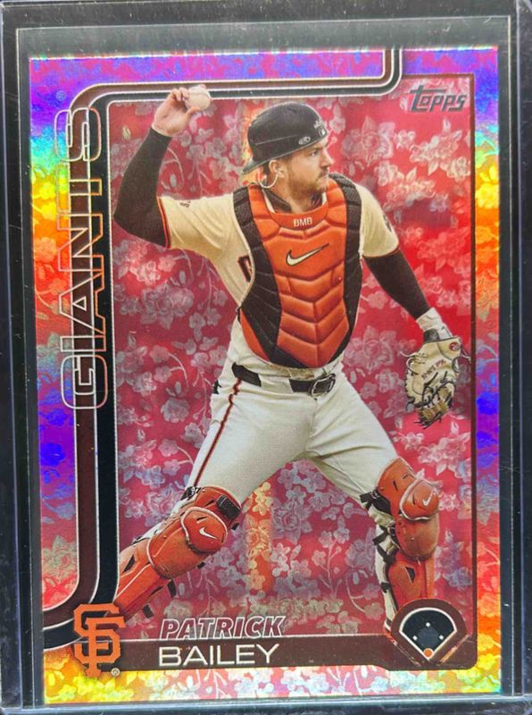 The Patrick Bailey 2025 Topps #70 Holiday Flowers /50 card is 1 of 93 Patrick Bailey's card variations in the 2025 Topps set being tracked by Sports Card Investor, including Base, Aqua Holo Foil, Diamante Foil, Holo Foil, and Pink Diamante Foil.